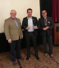 Cesar Donato, ao centro, em nome da FOCCUS DIGITAL recebe a Placa de Homenagem de Reconhecimento e Renovação da Parceria com a GATESAIR. Da esquerda para a direita o CEO da GatesAir Mr. Bruce Swail e o seu Diretor de Vendas para a *CALA Mr. Alberto Salazar.